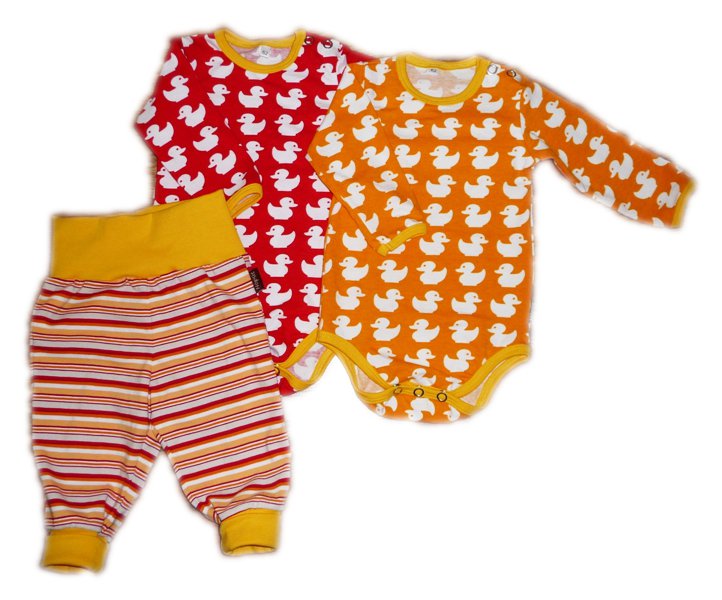 Eli kaksi ankkabodya ja trikoiset housut, kaikki kokoa 62cm. Housut sopivat molempien bodien kanssa hyvin yhteen. Prinsessan äiti on kova ankkafani, joten ankkatrikoon valinta oli helppoa..